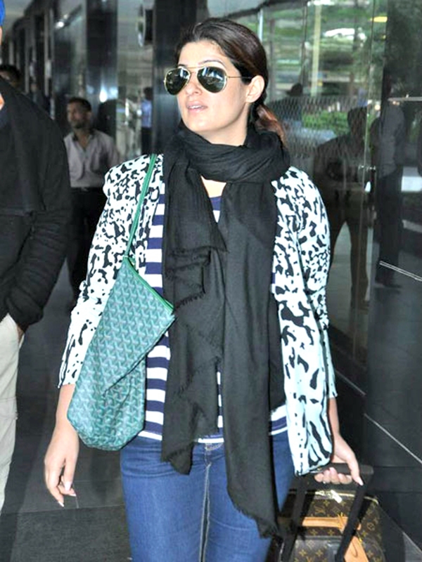 Twinkle Khanna: Twinkle looked stylish in a black and white animal printed jacket. She added a black stole to keep herself warm.
